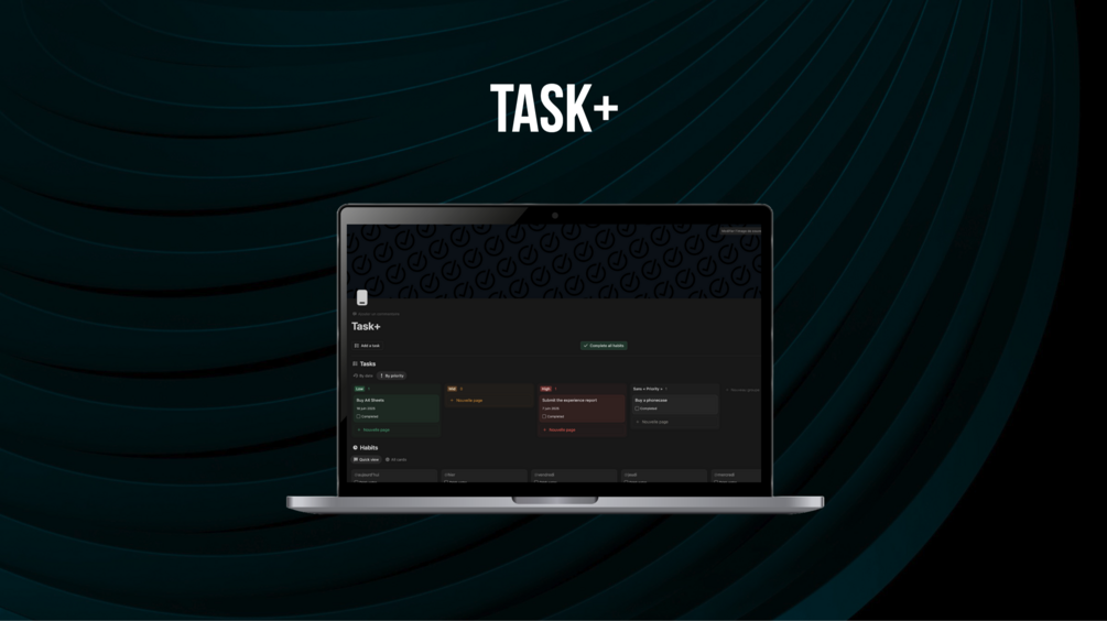 Task+ is a structured tool to efficiently organize your tasks and daily habits. Rank your tasks by priority, track their progress, and build healthy, balanced routines. This template supports you in achieving both personal and professional goals.